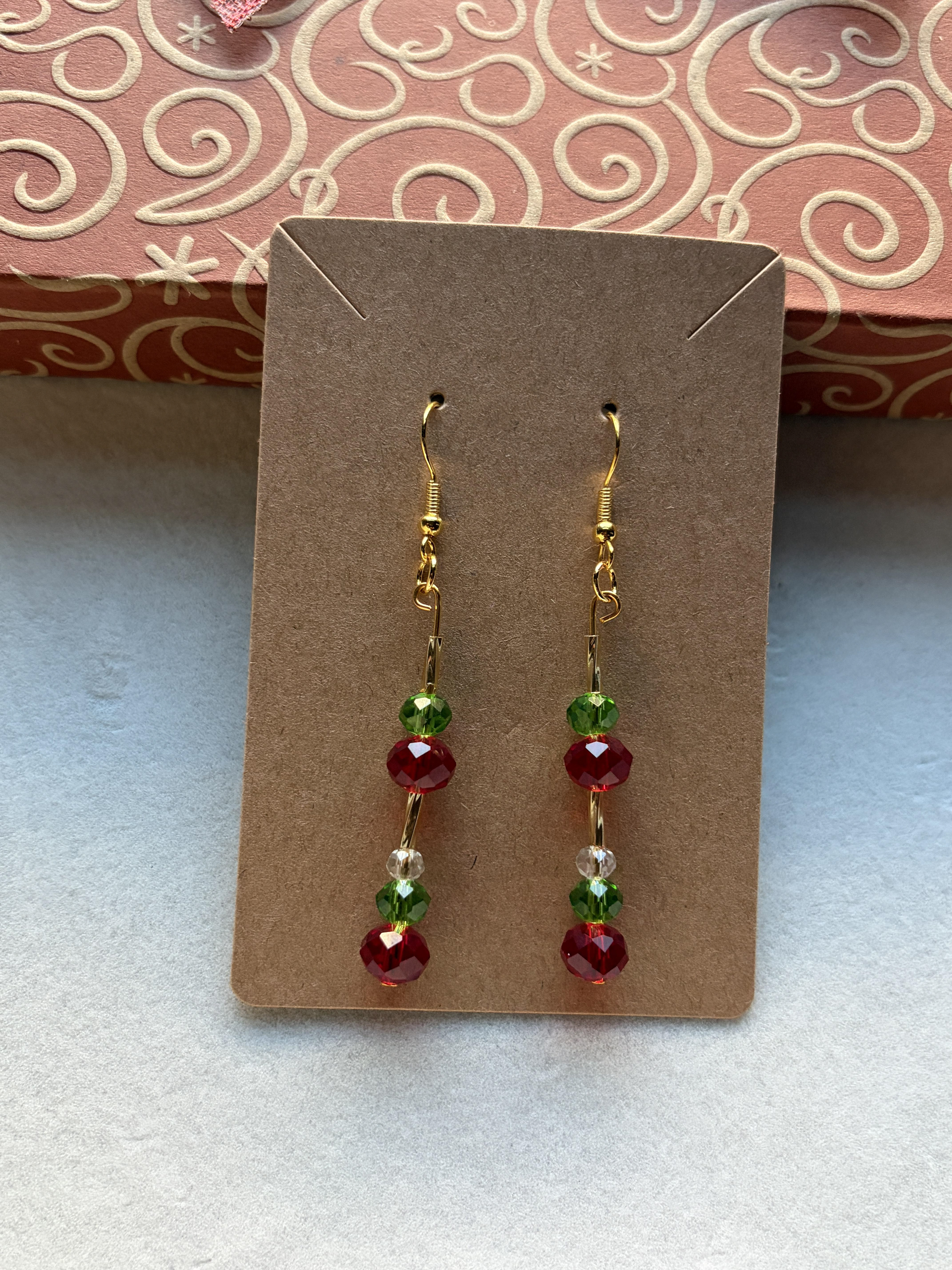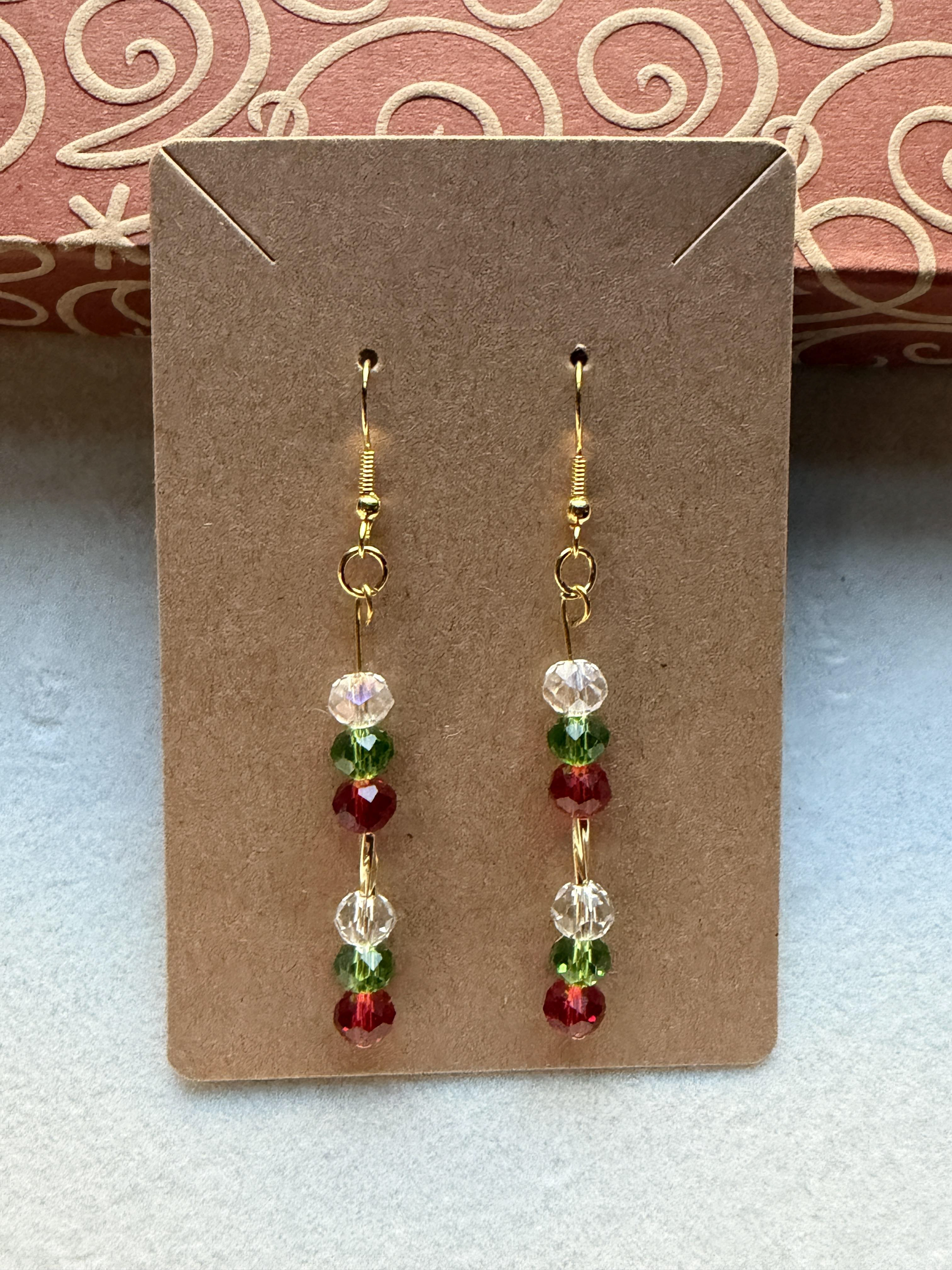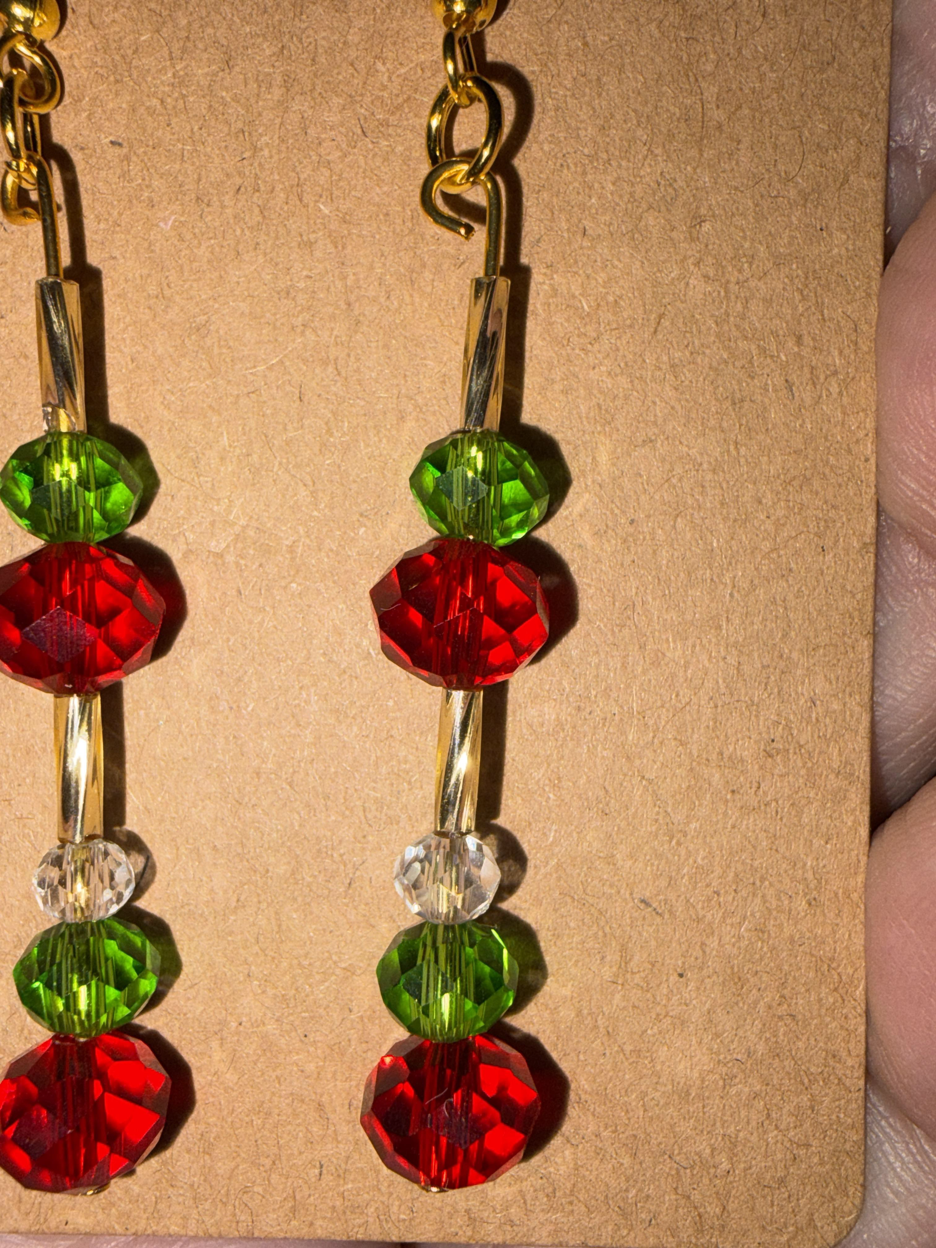 Handmade Medium Clear/Red/Green Crystal & Embellished Gold Beaded Earrings on gold hypoallergenic posts with rubber backing Style# 018