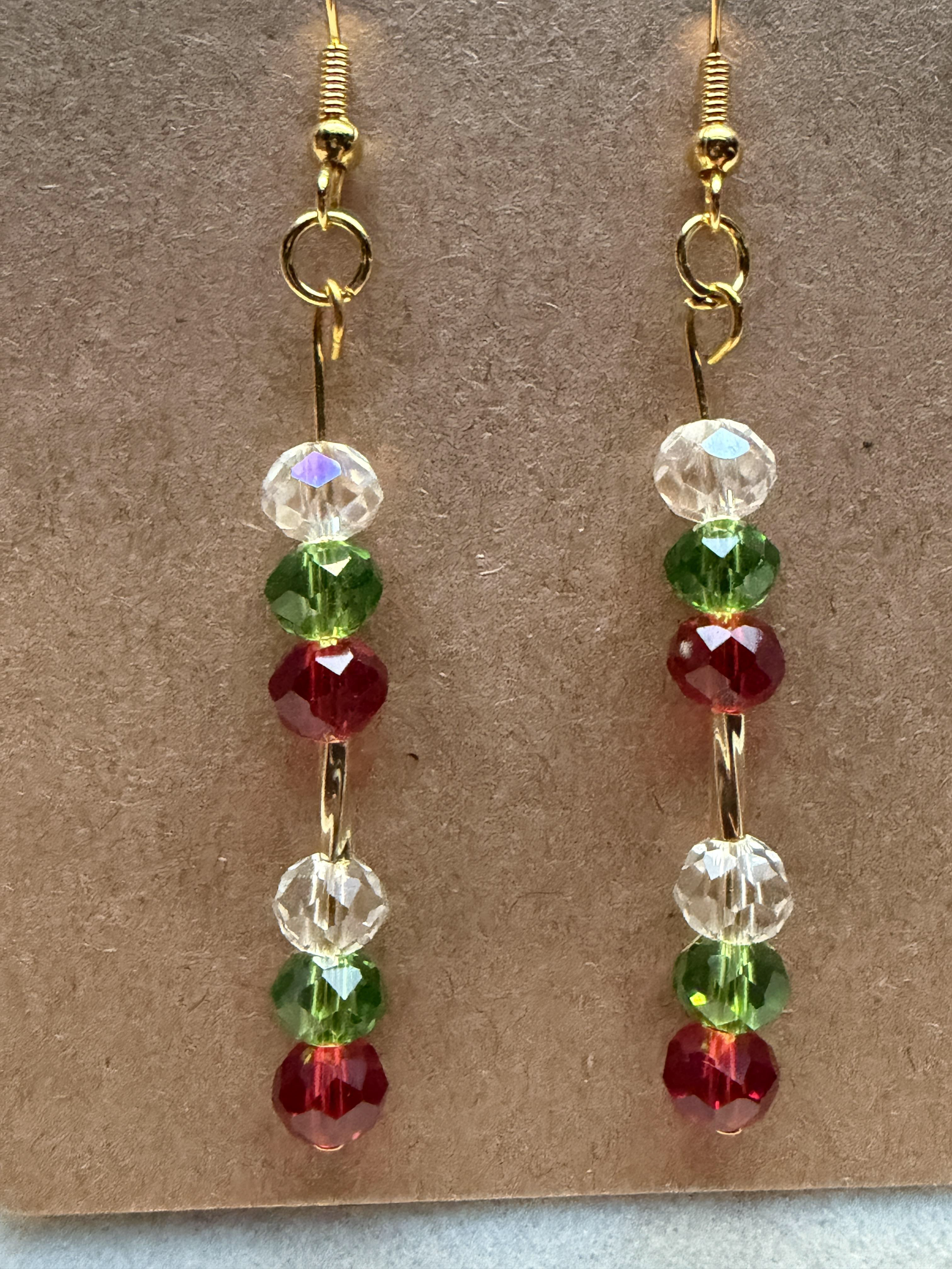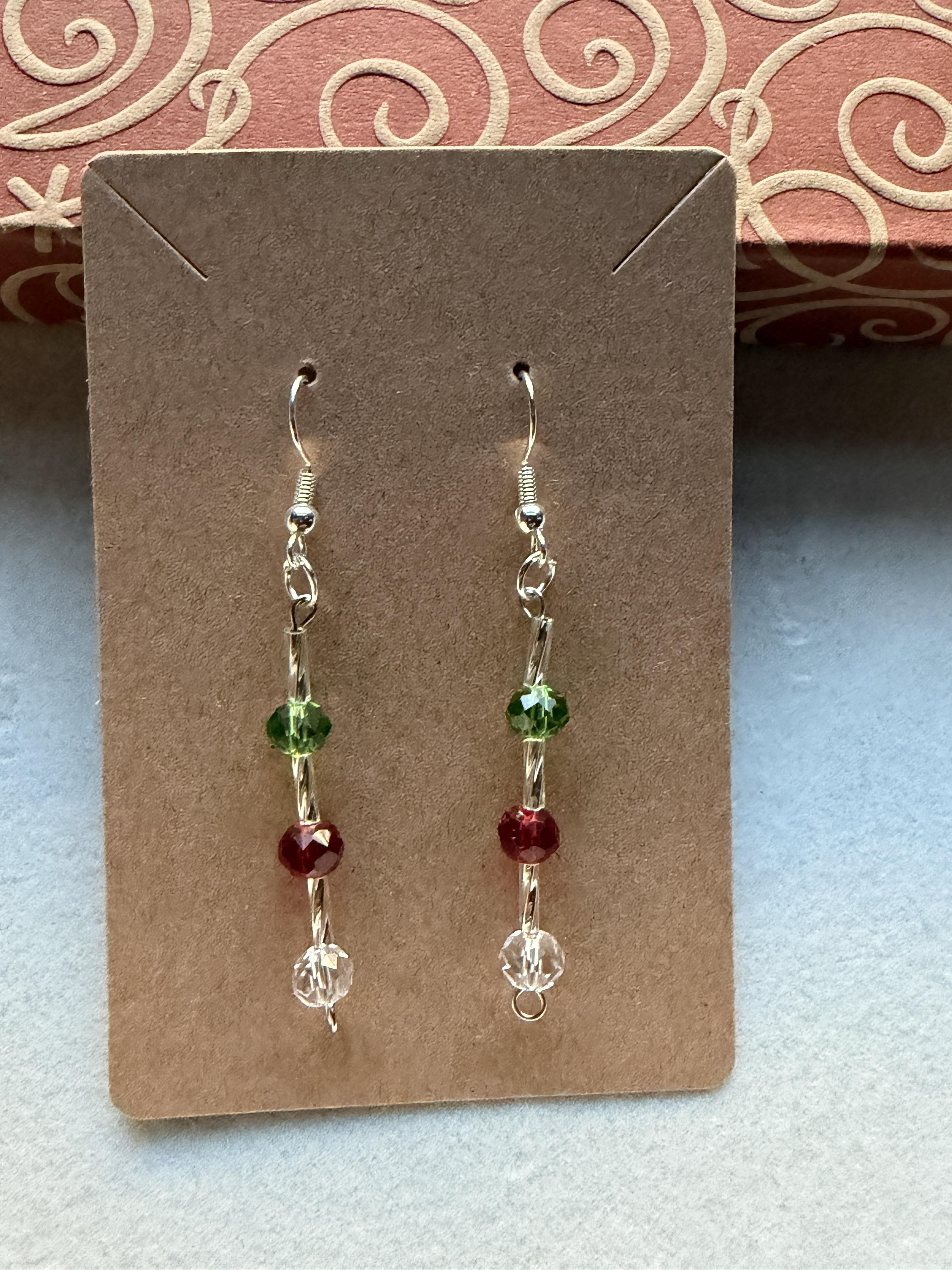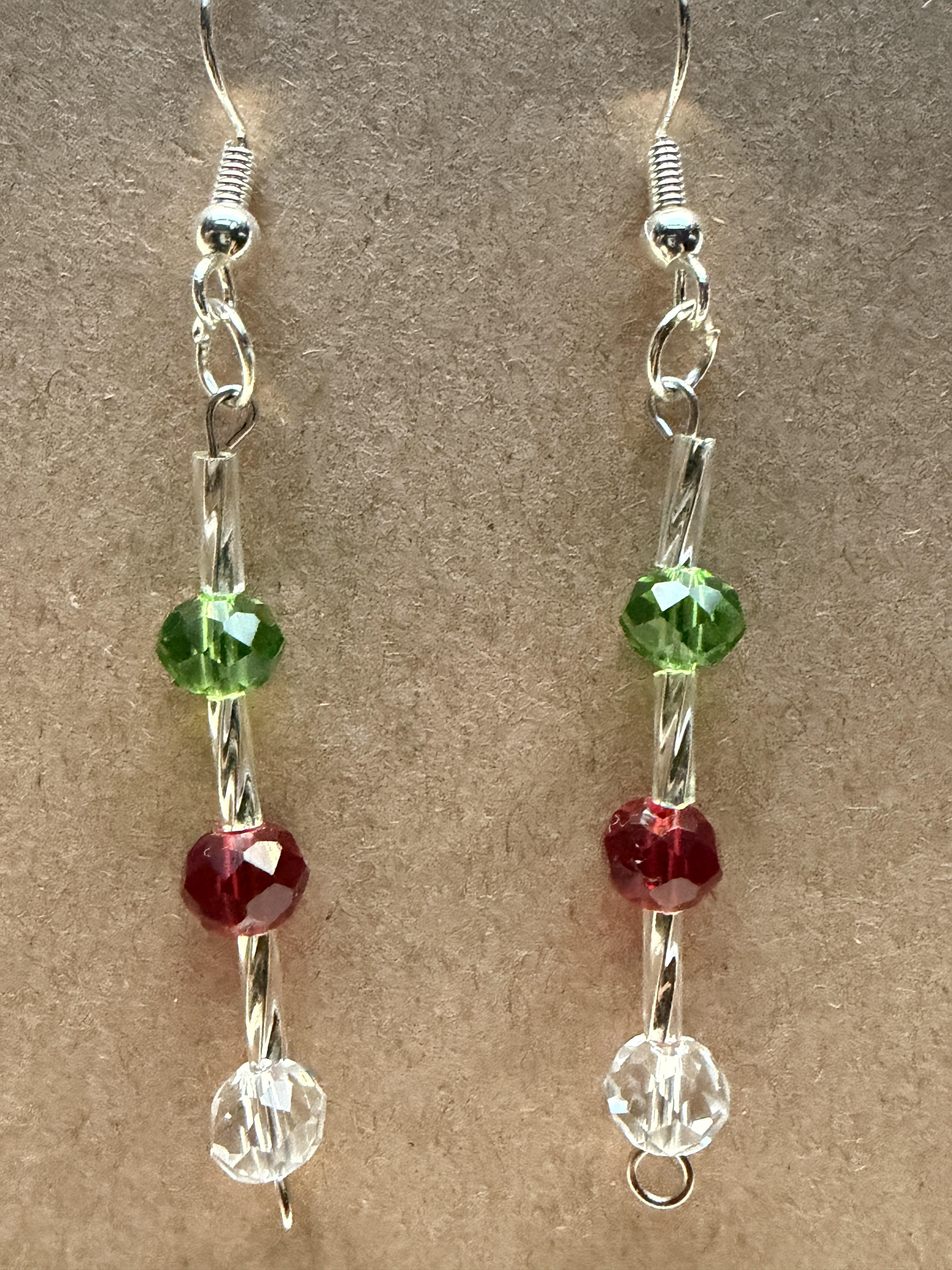 Handmade earrings with clear white, green and red beads on silver hypoallergenic posts with rubber backing Style# 001
