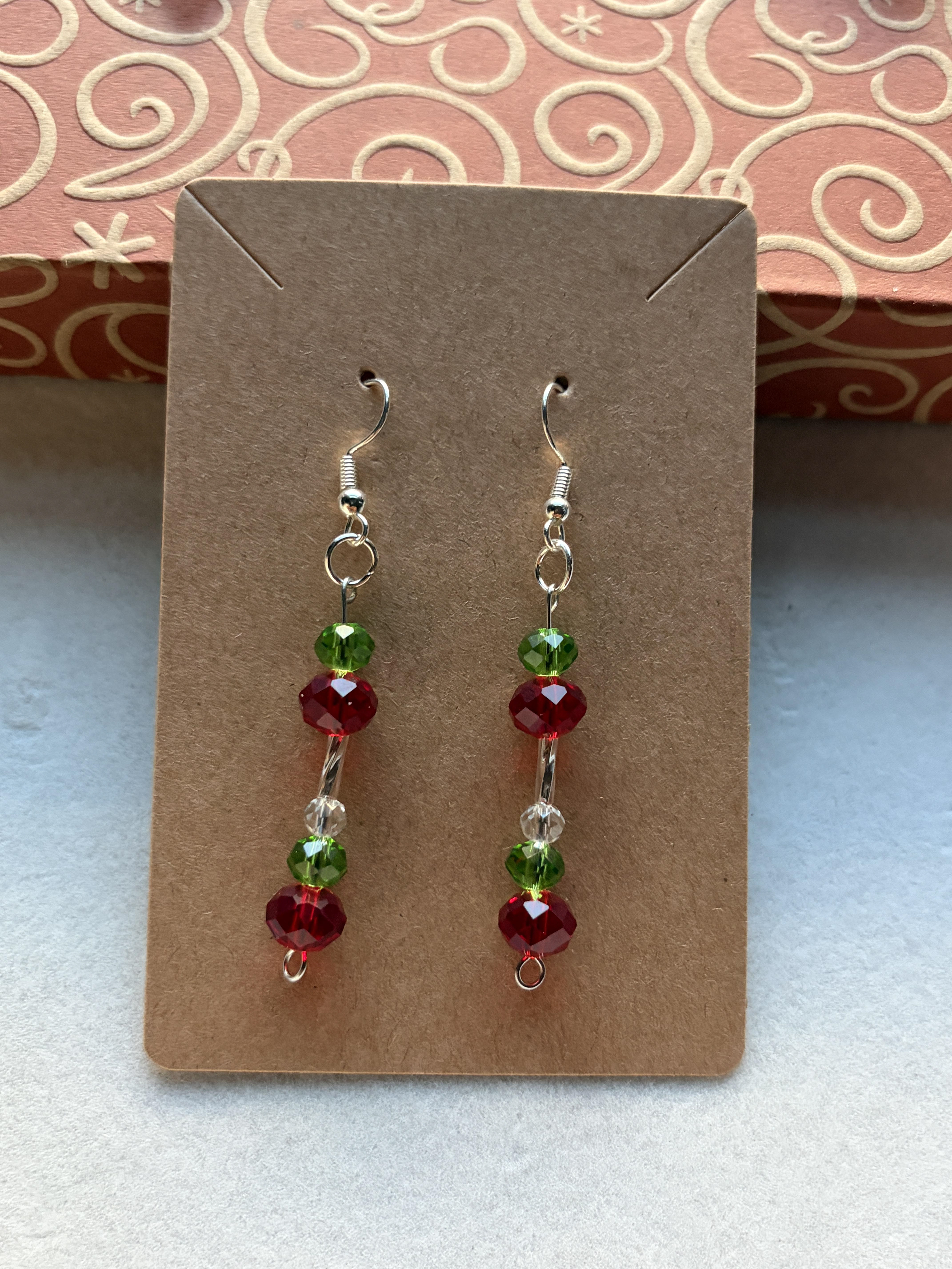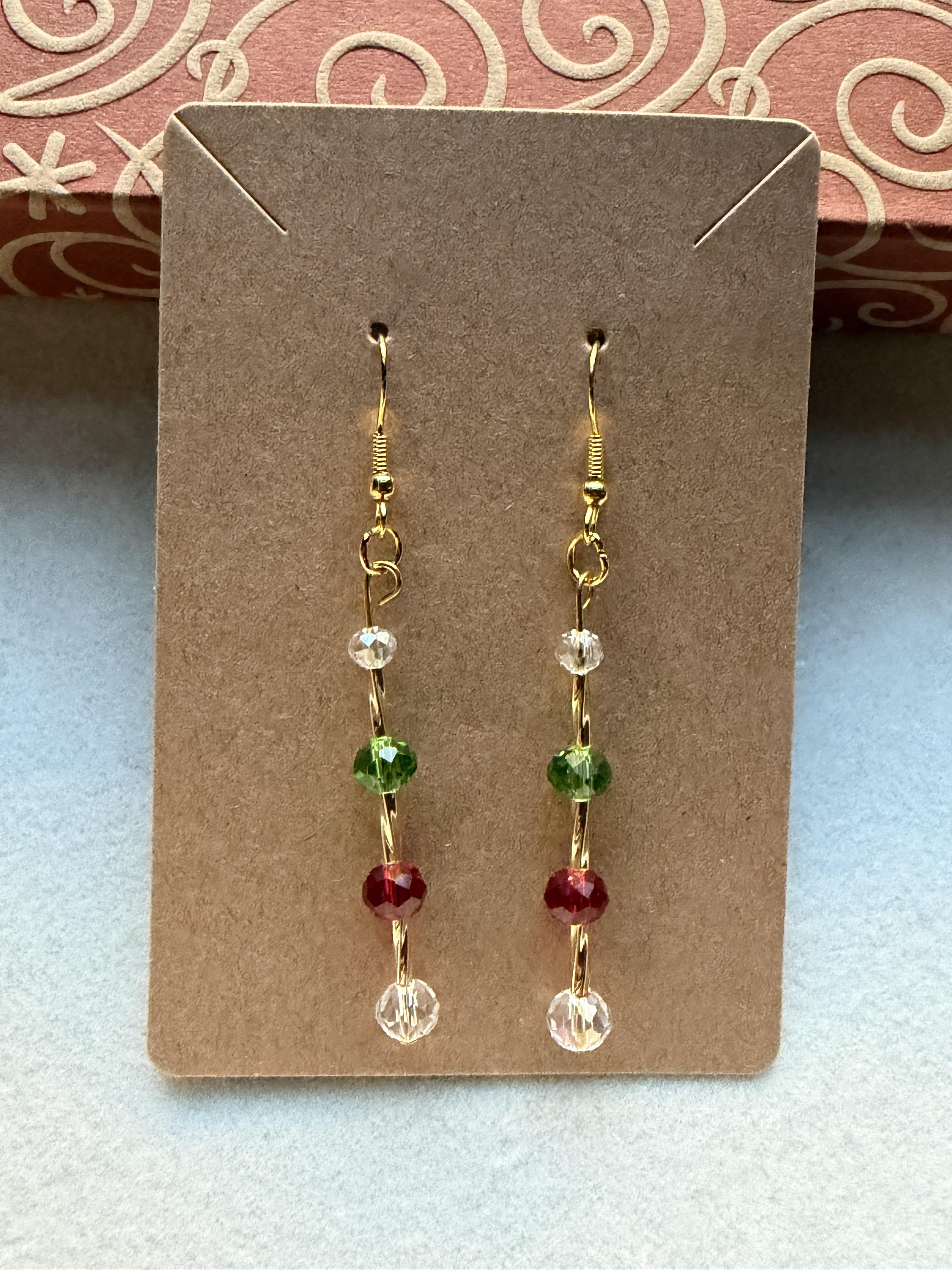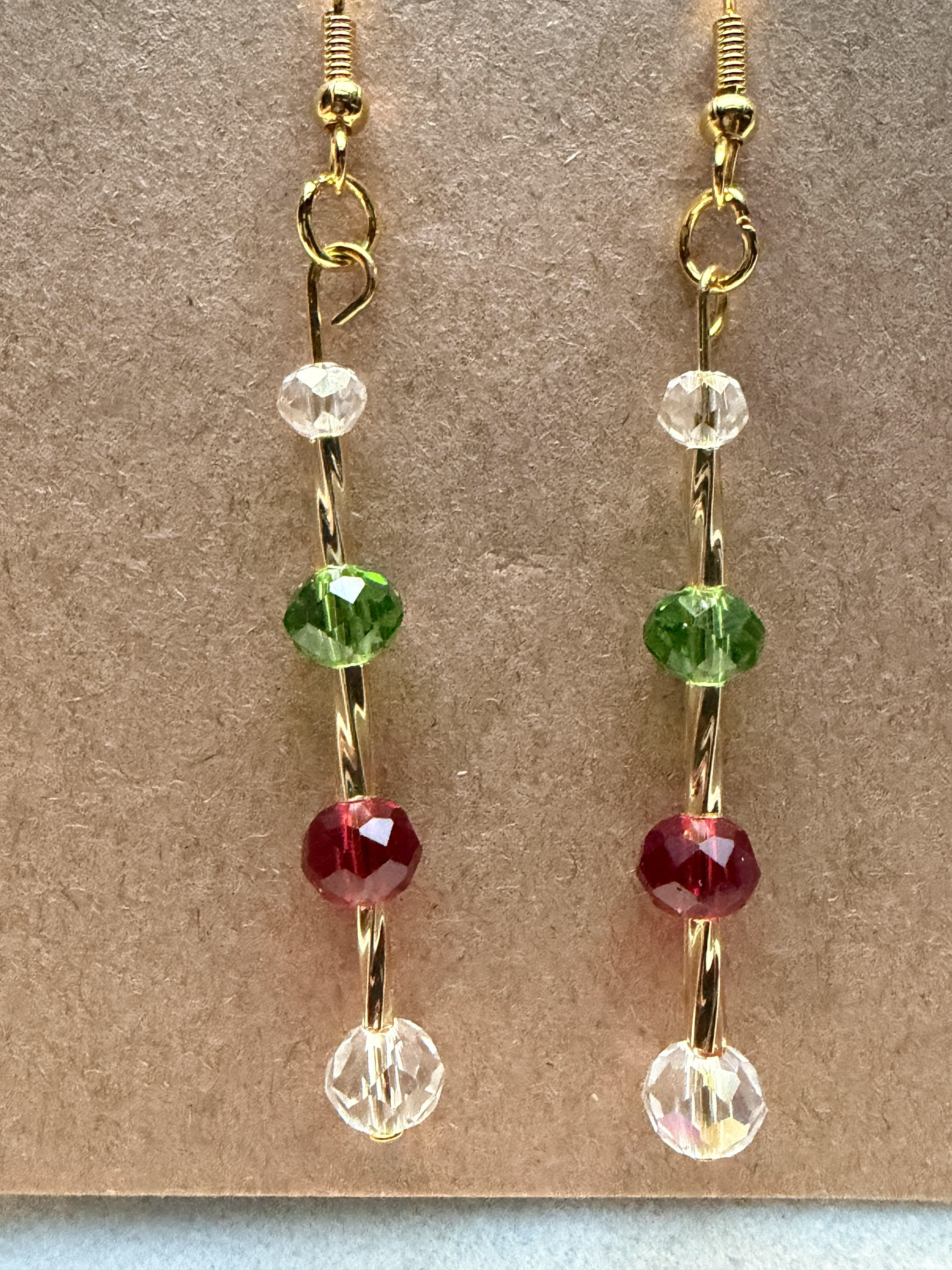 Handmade earrings with clear white, green and red beads on silver hypoallergenic posts with rubber backing Style# 001